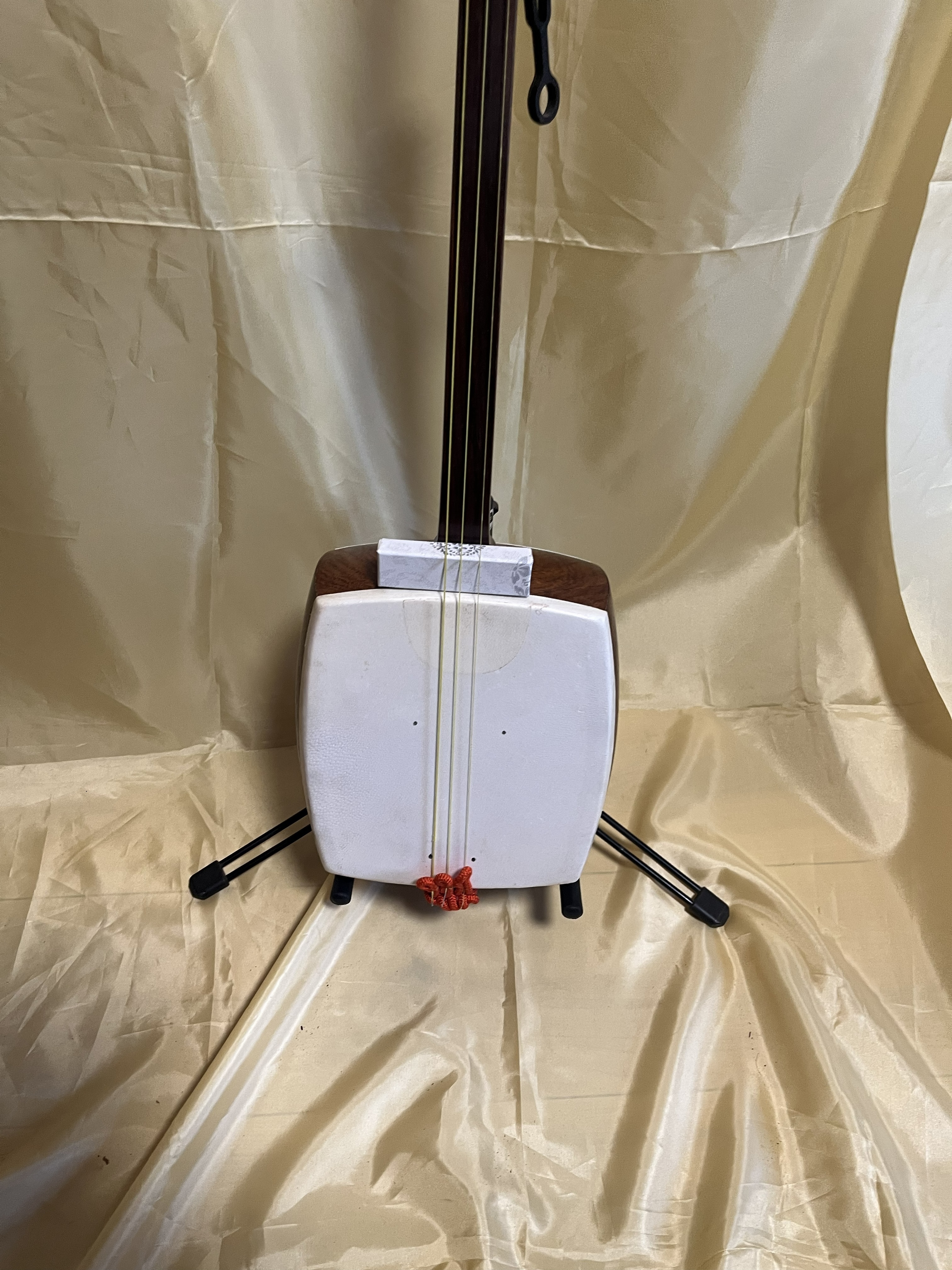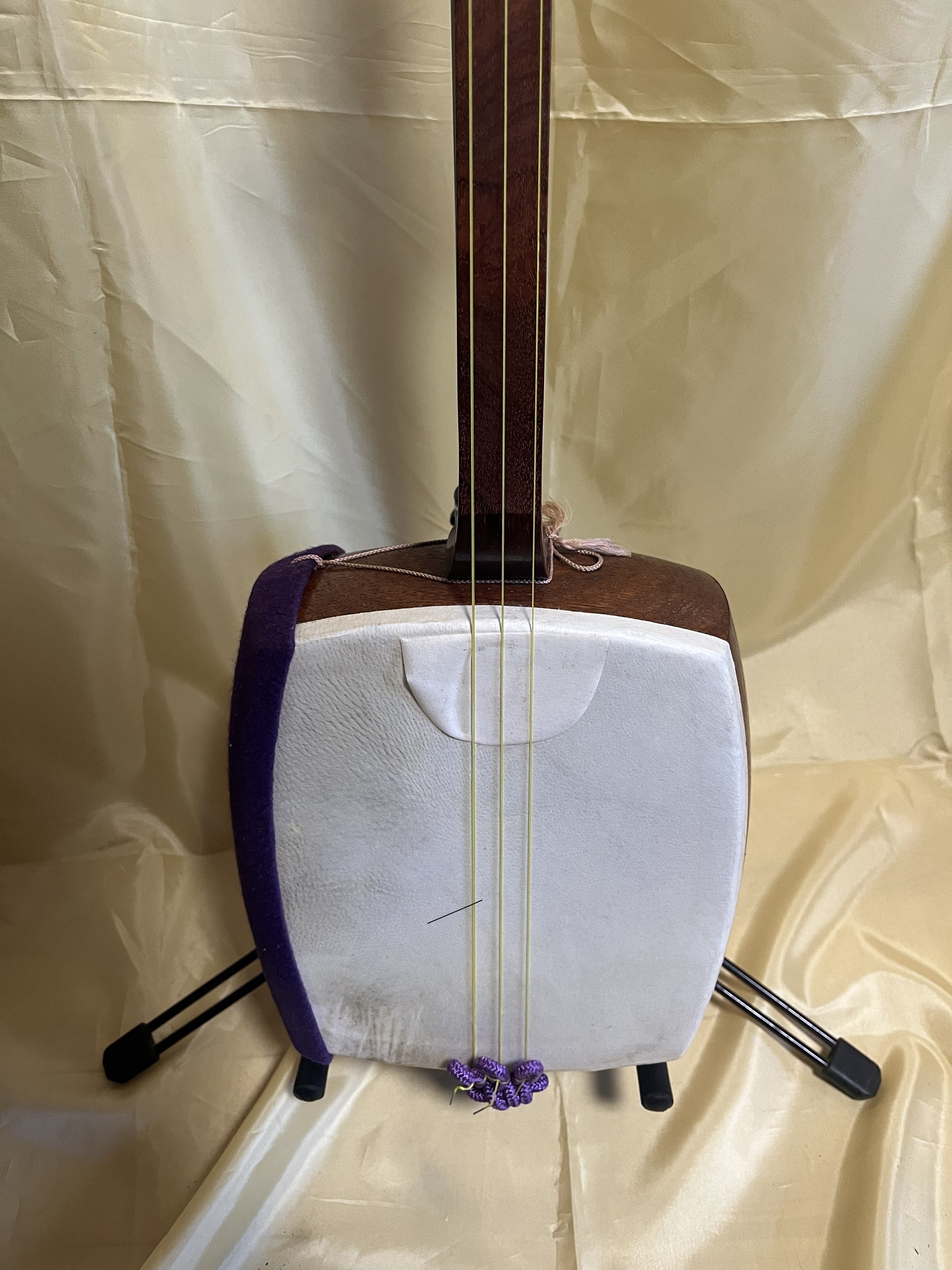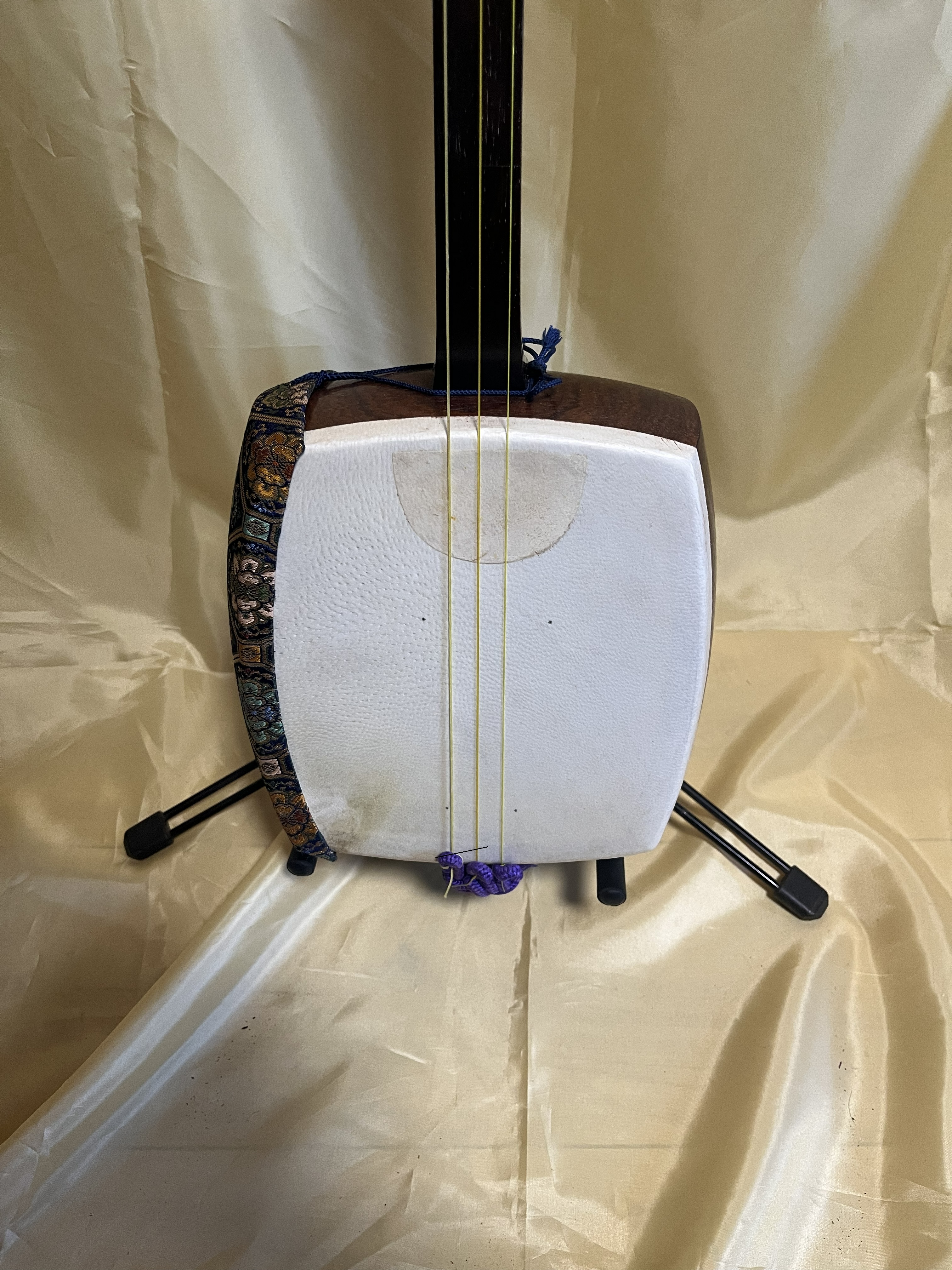棹:紫檀材二つ折れ 胴:花梨材 皮:両犬 |